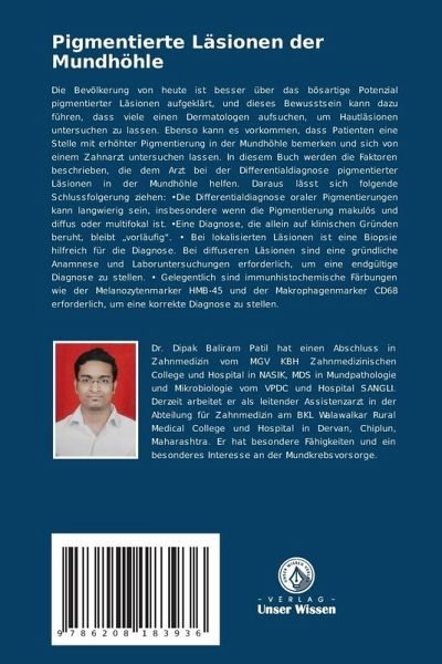 Die Bevölkerung von heute ist besser über das bösartige Potenzial pigmentierter Läsionen aufgeklärt, und dieses Bewusstsein kann dazu führen, dass viele einen Dermatologen aufsuchen, um Hautläsionen untersuchen zu lassen. Ebenso kann es vorkommen, dass Patienten eine Stelle mit erhöhter Pigmentierung in der Mundhöhle bemerken und sich von einem Zahnarzt untersuchen lassen. In diesem Buch werden die Faktoren beschrieben, die dem Arzt bei der Differentialdiagnose pigmentierter Läsionen in der Mundhöhle helfen. Daraus lässt sich folgende Schlussfolgerung ziehen: -Die Differentialdiagnose oraler Pigmentierungen kann langwierig sein, insbesondere wenn die Pigmentierung makulös und diffus oder multifokal ist. -Eine Diagnose, die allein auf klinischen Gründen beruht, bleibt "vorläufig". - Bei lokalisierten Läsionen ist eine Biopsie hilfreich für die Diagnose. Bei diffuseren Läsionen sind eine gründliche Anamnese und Laboruntersuchungen erforderlich, um eine endgültige Diagnose zu stellen. - Gelegentlich sind immunhistochemische Färbungen wie der Melanozytenmarker HMB-45 und der Makrophagenmarker CD68 erforderlich, um eine korrekte Diagnose zu stellen.