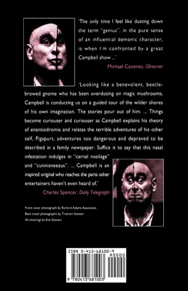 "The only time I feel like dusting down the term 'genius', in the pure sense of an influential demonic character, is when I'm confronted by a great Ken Campbell show." (Michael Coveney, Observer) "Campbell is conducting us on a guided tour of the wilder shores of his own imagination. The stories pour out of him...Things become curiouser and curiouser as Campbell explains his theory of enantiodromia and relates the terrible adventures of his other self, Pigspurt, adventures too dangerous and depraved to be described in a family newspaper. Suffice it to say that this nasal infestation indulges in "carnal nosilage" and "cunnisneezus"...Campbell is an inspired original who reaches the parts other entertainers haven't even heard of." (Charles Spencer, Daily Telegraph) "Demonstrates Ken Campbell's talent for capturing a comic moment and blowing it up into a great balloon of idiotic fantasy" (Jane Ellison, Evening Standard)