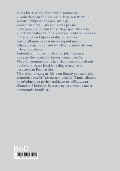 Tässä kirjassaan John Bunyan kannustaa kilvoittelemaan kohti taivasta, käyttäen Paavalin vertausta kilparadalla juoksusta ja vanhatestamentillista kielikuvaa paosta turvakaupunkiin, kun verikostaja ajaa takaa. On kiidettävä vinhaa vauhtia, elämä ja henki on kyseessä, löntystelijä tai kilpaan osallistumaton ei voittopalkintoa saa tai turvakaupunkiin ehdi. Kilpajuoksijan on riisuttava yltään painolastit: oma pyhyys ja pahuus. Kuitenkin on toivoa myös sille, joka uupuu ja kompastelee matkalla, Jeesus kantaa perille. Väkevä parannussaarna ja kirkas armoevankeliumi kuuluvat kirjassa lehti lehdeltä, esitetyt asiat perustellaan Raamatulla. Pikataival taivaaseen -kirja on ilmestynyt suomeksi aiemmin nimellä Taivaaseen juoksija. Tämä käännös on erilainen, on pyritty tarkkaan uskollisuuteen alkutekstiä kohtaan, käytetty nykysuomea ja uusia raamatunkäännöksiä.