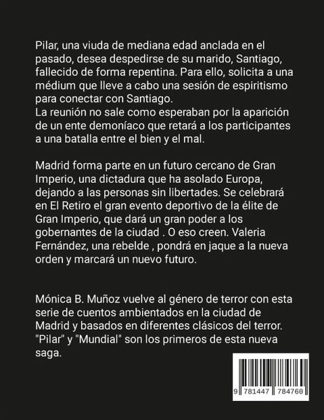 Cuentos Terroríficos de Madrid es una compilación de relatos ambientados en la capital de España en diferentes barrios y épocas. Inspirada en clásicos del terror, Mónica B. Muñoz vuelve a sus orígenes y, en este primer volumen, incluye "Pilar", la batalla de una mujer entre el bien y el mal en medio de la Movida madrileña en Chueca, y "Mundial", la supervivencia desesperada de Valeria en el Mundial de Cazadores de Gran Imperio, una nueva orden política europea opresiva que llegará en un futuro cercano, que se celebrará en El Retiro.