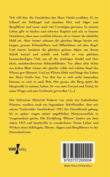 Der Schweizer Heinrich Federer war nicht nur katholischer Priester, sondern auch ein begnadeter Schriftsteller, dem mit seinen "Lachweiler Geschichten" 1911 der Durchbruch gelang, bis er später wegen seiner angeblichen Homosexualität in Vergessenheit geriet. Die Erzählung "Pilatus" datiert aus dem Jahre 1913 und beschreibt in wunderbarer Weise Leben und Wirken eines Schlingels, Hirten, Jägers und Bergführers in der Zentralschweiz.