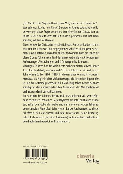 Die Briefe des Apostels Paulus betrachten den Christen häufig in seiner in Jesus Christus bereits erreichten himmlischen Dimension. Jakobus, Petrus und Judas haben in ihren Schriften schwerpunktmäßig einen anderen Aspekt des Christseins im Blick: Ihnen geht es um den Wandel, der für Christen de facto noch auf der Erde stattfindet. Da der Christ durch den Kreuzestod Jesu Christi jedoch bereits von dieser Erde losgekauft ist, ist er hier unten im Grunde nur noch ein "Pilger in einer fremden Welt".John Nelson Darbys (1800-1885) Schriften, die in diesem Buch (mit einer Ausnahme) erstmalig aus dem Englischen übersetzt und kommentiert wurden, erweisen sich als äußerst hilfreich, um die Briefe des Jakobus, Petrus und Judas tiefer zu verstehen. Dabei wird man teils erschreckende Parallelen zu den kirchlichen und religiösen Fehlentwicklungen unserer Zeit entdecken.