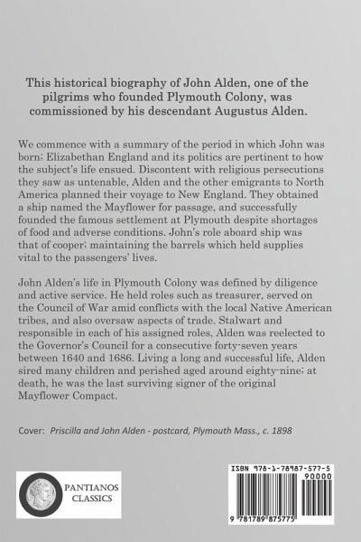 This historical biography of John Alden, one of the pilgrims who founded Plymouth Colony, was commissioned by his descendant Augustus Alden. We commence with a summary of the period in which John was born; Elizabethan England and its politics are pertinent to how the subject's life ensued. Discontent with religious persecutions they saw as untenable, Alden and the other emigrants to North America planned their voyage to New England. They obtained a ship named the Mayflower for passage, and successfully founded the famous settlement at Plymouth despite shortages of food and adverse conditions. John's role aboard ship was that of cooper; maintaining the barrels which held supplies vital to the passengers' lives. John Alden's life in Plymouth Colony was defined by diligence and active service. He held roles such as treasurer, served on the Council of War amid conflicts with the local Native American tribes, and also oversaw aspects of trade. Stalwart and responsible in each of his assigned roles, Alden was reelected to the Governor's Council for a consecutive forty-seven years between 1640 and 1686. Living a long and successful life, Alden sired many children and perished aged around eighty-nine; at death, he was the last surviving signer of the original Mayflower Compact.