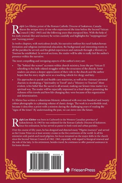 Ralph Leo Kleiter, priest of the Roman Catholic Diocese of Saskatoon, Canada shares the unique story of one who experienced the time before the Second Vatican Council (1962-1965) and the following years that energized him. With the help of his daily journal, files and memory he writes candidly and highlights his "steppingstones" and "turning points". In twelve chapters, with meticulous details, his narrative outlines his rural Saskatchewan formation and religious institutional education; the background and interesting events in all the parishes he served; and his global experiences and outreach through a Ministry to Tourism he established. In several sections, the reader will be able to really feel the author's presence within the narrative. The most compelling and intriguing aspects of the author's story are: ¿The "behind-the-scenes" accounts within church ministry, from the pre-Vatican II schooling to his faith-related struggles within the structures of the church. Some readers can attain a deeper appreciation of their role in the church and the author hopes that his story might serve as a teaching vehicle for clergy and laity. ¿His approaches in parish and health-care ministries, as well as his visionary personal charism in developing a "Spirituality in Travel" and a "Ministry to Tourism". Most evident, is his belief that the sacred is all around, making our leisure time matter in a spiritual way. The reader will be especially impressed in a final chapter presenting the richness of his travels and how life-changing they were because of his organization and determination. Fr. Kleiter has written a voluminous Memoir, enhanced with over one-hundred and twenty colour photographs in a pleasing volume of classic design. The work is a worthwhile read, because it describes a priest with a mission during the challenging years of reading the "signs of the times". By understanding the past, we can move into the future.
