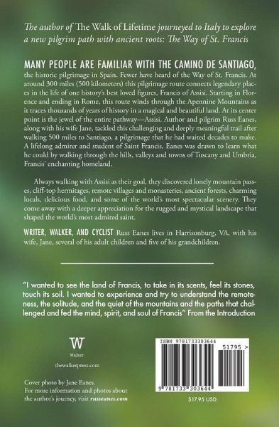 MANY PEOPLE ARE FAMILIAR WITH the Camino de Santiago, the historic pilgrimage in Spain. Fewer have heard of the Way of St. Francis. At around 300 miles (500 kilometers) this pilgrimage route connects legendary places in the life of history's best loved saint, Francis of Assisi. Starting in Florence and ending in Rome, this route winds through the Apennine Mountains as it traces thousands of years of history in a magical and beautiful land. At its center point is the jewel of the entire pathway-Assisi. Author and pilgrim Russ Eanes, along with his wife Jane, tackled this challenging and deeply meaningful trail after walking 500 miles to Santiago, a pilgrimage that he had waited decades to make. A lifelong admirer and student of Saint Francis, Eanes was drawn to learn what he could by walking through the hills, valleys and towns of Tuscany and Umbria, Francis' enchanting homeland. Always walking with Assisi as their goal, they discovered lonely mountain passes, cliff-top hermitages, remote villages and monasteries, ancient forests, charming locals, delicious food, and some of the world's most spectacular scenery. They come away with a deeper appreciation for the rugged and mystical landscape that shaped the world's most admired saint.