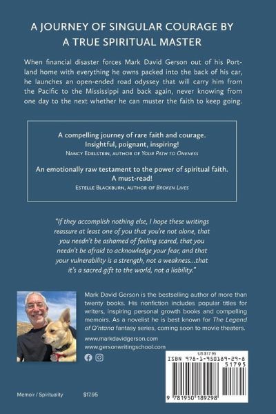 A Journey of Singular Courage by a True Spiritual Master When financial disaster forces Mark David Gerson out of his Portland home with everything he owns packed into the back of his car, he launches an open-ended road odyssey that will carry him from the Pacific to the Mississippi and back again, never knowing from one day to the next whether he can muster the faith to keep going. "If they accomplish nothing else, I hope these writings reassure at least one of you that you're not alone, that you needn't be ashamed of feeling scared, that you needn't be afraid to acknowledge your fear, and that your vulnerability is a strength, not a weakness...that it's a sacred gift to the world, not a liability." "I don't know anyone who has regularly risked more, given up more, to be a writer." - Will Reichard, author of Evertime Mark David Gerson is not only a master of the word, but also a master of the heart. - Joan Cerio, author of Heartwired to Heaven: Unlocking the Power of the Creative Heart