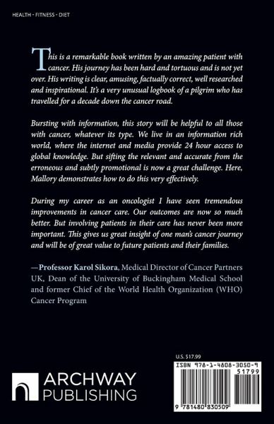 This is a remarkable book written by an amazing patient with cancer. His journey has been hard and tortuous and is not yet over. His writing is clear, amusing, factually correct, well researched and inspirational. It’s a very unusual logbook of a pilgrim who has travelled for a decade down the cancer road. Bursting with information, this story will be helpful to all those with cancer, whatever its type. We live in an information rich world, where the internet and media provide 24 hour access to global knowledge. But sifting the relevant and accurate from the erroneous and subtly promotional is now a great challenge. Here, Mallory demonstrates how to do this very effectively. During my career as an oncologist I have seen tremendous improvements in cancer care. Our outcomes are now so much better. But involving patients in their care has never been more important. This gives us great insight of one man’s cancer journey and will be of great value to future patients and their families. —Professor Karol Sikora, Medical Director of Cancer Partners UK, Dean of the University of Buckingham Medical School and former Chief of the World Health Organization (WHO) Cancer Program
