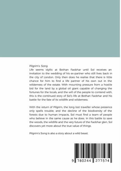 Life seems idyllic at Bothan Faobhar until Sol receives an invitation to the wedding of his ex-partner who still lives back in the city of London. Only then does he realise that there is little chance for him to find a life partner of his own out in the wilderness of the estate. With mounting pressure from a hostile bid for the land by a global oil giant capable of changing the fortunes for the locals, and the will of the people to contend with, this is the continued story of Sol's life at Bothan Faobhar and his battle for the fate of its wildlife and wilderness. With the return of Pilgrim, the long lost traveller whose presence only spells trouble, and the decline of the biodiversity of the forests due to human impacts, Sol must find a team of people who believe in the same cause as he does. In this battle to save the woods, the wildlife and the very future of the Faobhar glen, Sol discovers yet more about the true value of things. Pilgrim's Song is also a story about a wild beast.
