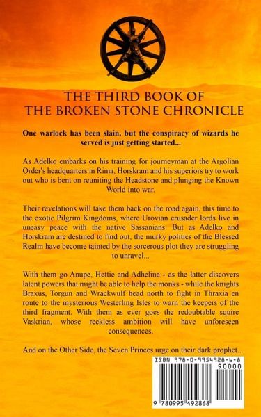 One warlock has been slain, but the conspiracy of wizards he served is just getting started... As Adelko embarks on his training for journeyman at the Argolian Order's headquarters in Rima, Horskram and his superiors try to work out who is bent on reuniting the Headstone and plunging the Known World into war. Their revelations will take them back on the road again, this time to the exotic Pilgrim Kingdoms, where Urovian crusader lords live in uneasy peace with the native Sassanians. But as Adelko and Horskram are destined to find out, the murky politics of the Blessed Realm have become tainted by the sorcerous plot they are struggling to unravel... With them go Anupe, Hettie and Adhelina - as the latter discovers latent powers that might be able to help the monks - while the knights Braxus, Torgun and Wrackwulf head north to fight in Thraxia en route to the mysterious Westerling Isles to warn the keepers of the third fragment. With them as ever goes the redoubtable squire Vaskrian, whose reckless ambition will have unforeseen consequences. And on the Other Side, the Seven Princes urge on their dark prophet...