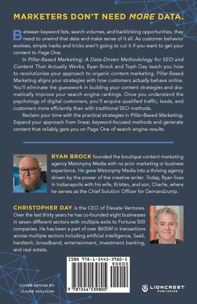 Marketers don't need more data. Between keyword lists, search volumes, and backlinking opportunities, they need to unwind that data and make sense of it all. As customer behavior evolves, simple hacks and tricks aren't going to cut it if you want to get your content to Page One. In Pillar-Based Marketing: A Data-Driven Methodology for SEO and Content That Actually Works, Ryan Brock and Toph Day teach you how to revolutionize your approach to organic content marketing. Pillar-Based Marketing aligns your strategies with how customers actually behave online. You'll eliminate the guesswork in building your content strategies and dramatically improve your search engine rankings. Once you understand the psychology of digital customers, you'll acquire qualified traffic, leads, and customers more efficiently than with traditional SEO methods. Reclaim your time with the practical strategies in Pillar-Based Marketing. Expand your approach from linear, keyword-focused methods and generate content that reliably gets you on Page One of search engine results.