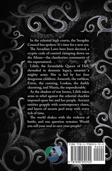 In the celestial high courts, the Seraphic Council has spoken: It's time for a new era. The Arcadian Laws have been decreed, a cryptic code of control clamping down on the Alium-the clandestine community of the supernatural. Lilith, the formidable Queen of Hell, shrouded in demonic legacy, amasses a mighty army. She is led by her four dangerous children: Astaroth, the ruthless, Estrie, the cunning, Loukas, the darkly charming, and Mania, the unpredictable. As the shadow of war looms, Lilith takes arms to rebel against the celestial shackles imposed upon her and her people. Ancient entities grapple with contemporary chaos, and layers of secrets peel away with every tick of time. The world shakes with the violence of battle, and one question remains: Would you sell your soul to save your people?