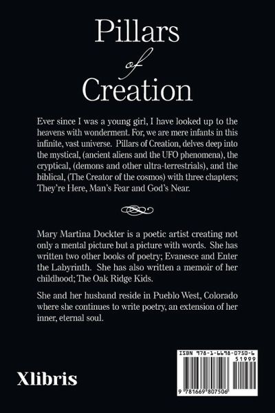 Ever since I was a young girl, I have looked up to the heavens with wonderment. For, we are mere infants in this infinite, vast universe. Pillars of Creation delves deep into the mystical, (ancient aliens and the UFO phenomena). The cryptical, (demons and other ultra-terrestrials). And the biblical, (The Creator of the cosmos) with three chapters, They're Here, Man's Fear and God's Near.