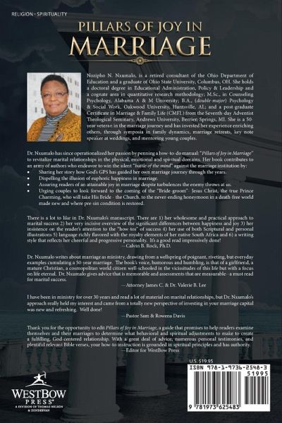 Dr. Nxumalo has since operationalized her passion by penning a how-to-do manual: "Pillars of Joy in Marriage" to revitalize marital relationships in the physical, emotional and spiritual domains. Her book contributes to an army of authors who endeavor to win the silent "battle of the mind" against the marriage institution by: Sharing her story how God's GPS has guided her own marriage journey through the years. Dispelling the illusion of euphoric happiness in marriage. Assuring readers of an attainable joy in marriage despite turbulences the enemy throws at us. Urging couples to look forward to the coming of the "Bride-groom"- Jesus Christ, the true Prince Charming, who will take His Bride - the Church, to the never-ending honeymoon in a death-free world made new and where pre-sin condition is restored. There is a lot to like in Dr. Nxumalo's manuscript. There are 1) her wholesome and practical approach to marital success 2) her very incisive overview of the significant differences between happiness and joy 3) her insistence on the reader's attention to the "how-tos" of success 4) her use of both Scriptural and personal illustrations 5) language richly flavored with the royalty elements of her native South Africa and 6) a writing style that reflects her cheerful and progressive personality. It's a good read impressively done! -Calvin B. Rock, Ph.D. Dr. Nxumalo writes about marriage as ministry, drawing from a wellspring of poignant, riveting, but everyday examples cumulating a 50-year marriage. The book's voice, humorous and humbling, is that of a girlfriend, a mature Christian, a cosmopolitan world citizen well-schooled in the vicissitudes of this life but with a focus on life eternal. Dr. Nxumalo gives advice that is memorable and assessments that are measurable--a must read for marital success. -Attorney James C. & Dr. Valerie B. Lee I have been in ministry for over 30 years and read a lot of material on marital relationships, but Dr. Nxumalo's approach really held my interest and came from a totally new perspective of investing in your marriage capital was new and refreshing. Well done! -Pastor Sam & Rowena Davis Thank you for the opportunity to edit Pillars of Joy in Marriage, a guide that promises to help readers examine themselves and their marriages to determine what behavioral and spiritual adjustments to make to create a fulfilling, God-centered relationship. With a great deal of advice, numerous personal testimonies, and plentiful relevant Bible verses, your how-to instruction is grounded in spiritual principles and has authority. -Editor for WestBow Press