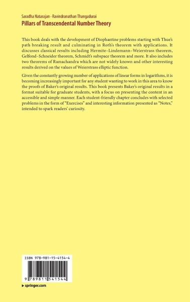 "In this small volume, the authors assemble the classical proofs of some of the important theorems from transcendental number theory mostly through the lens of Diophantine analysis. Written for the advanced reader ... . The book concludes with the seminal results of Baker's linear forms in logarithms and Schmidt's Subspace Theorem." (Edward B. Burger, Mathematical Reviews, April, 2022)