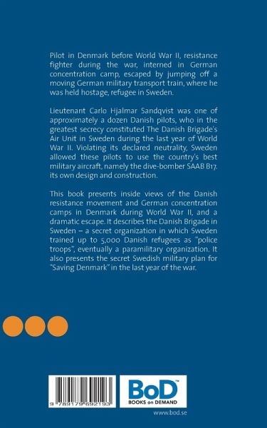 During the second half of World War II, Sweden began to provide confidential assistance to its two neighbours, Norway and Denmark. This aid was in the form of so-called police camps, where refugees from these two German occupied countries could gather and prepare for a return to their homelands, when the Germans were expected to give up. In the home countries, these police forces were to restore order in society, and this motivation from neutral Sweden was tolerated by the Germans. But as time went on, the character changed from being police forces to becoming more and more regular military troops, although with simple weapons. The so-called Danish Brigade eventually consisted of nearly 5,000 Danish refugees, who were placed in various camps around Sweden. Among these Danish refugees, were slightly more than a dozen Danish pilots, who were secretly placed in pairs on different Swedish airbases. They eventually gained access to Sweden's foremost military aircraft, namely the Saab B17 dive-bomber. In the last days of the war, these pilots gathered at the F7 Såtenäs airbase on the shores of Lake Vänern, where they formed the Danish Brigade's Air Unit. Its main purpose was to support the Danish Brigade's return to Denmark. One of these pilots was the author's father, Lieutenant Carlo Hjalmar Sandqvist. Carlo is the "Pilot in the Danish Brigade in Sweden during the Second World War."This book presents inside views of the Danish resistance movement and German concentration camps in Denmark during World War II, and a dramatic escape. It describes the Danish Brigade in Sweden - a secret organization in which Sweden trained up to 5,000 Danish refugees as "police troops", eventually a paramilitary organization. It also presents the secret Swedish military plan for "Saving Denmark" in the last year of the war.