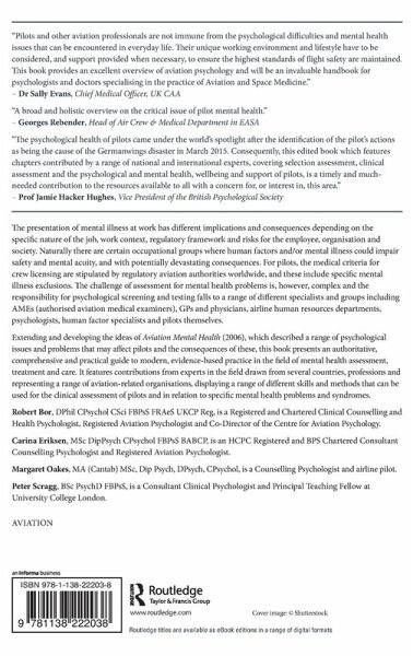 Robert Bor, DPhil CPsychol CSci FBPsS FRAeS UKCP Reg, is a Registered and Chartered Clinical Counselling and Health Psychologist, Registered Aviation Psychologist and Co-Director of the Centre for Aviation Psychology. Carina Eriksen, MSc DipPsych CPsychol FBPsS BABCP, is an HCPC Registered and BPS Chartered Consultant Counselling Psychologist and Registered Aviation Psychologist. Margaret Oakes, MA (Cantab) MSc, Dip Psych, DPsych, CPsychol, is a Counselling Psychologist and airline pilot. Peter Scragg, BSc PsychD FBPsS, is a Consultant Clinical Psychologist and Principal Teaching Fellow at University College London.