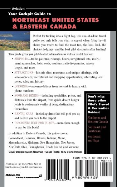Perfect for tucking into a flight bag, this one-of-a-kind travel guide not only tells you what to expect at airportsNit shows you where to find the most fun, the best food, the choicest lodgings, and the steepest pilot discounts in the Northeast and Eastern Canada! You get pilot-tested information and tips on airport conditions and facilities; local attractions, including admission fees; choices from low cost to high end lodgings, with phone numbers; names of the best restaurants, with specialties and prices, and alternatives for that quick bite; rental cars; and the most thorough coverage of available pilot discounts that you'll find anywhere! In addition to Eastern Canada, this guide covers Connecticut, Delaware, Illinois, Indiana, Maine, Massachusetts, Michigan, New Hampshire, New Jersey, New York, Ohio, Pennsylvania, Rhode Island, and Vermont.