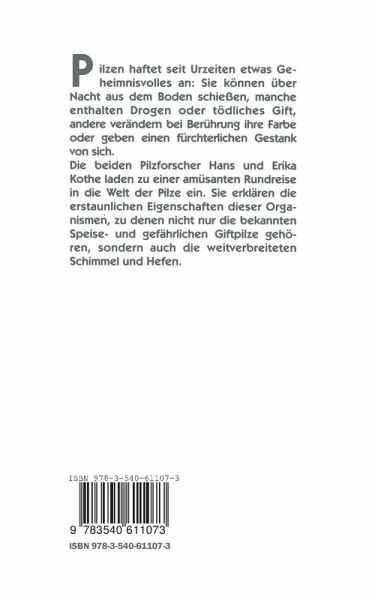 Wer bei Pilzen nur an leckere Champignons oder giftige Fliegenpilze denkt, wird von diesem Buch überrascht sein. Die beiden Pilzforscher Hans und Erika Kothe laden Sie zu einer informativen und unterhaltsamen Rundreise durch die vielgestaltige Welt der Pilze ein. Historische Anekdoten und aktuelle Beispiele veranschaulichen die biologische, medizinische und ökologische Bedeutung der Pilze.