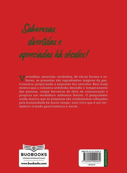 Vermelhas, amarelas, verdinhas, de várias formas e sabores, as pimentas são ingredientes mágicos da gastronomia, propiciando a expansão dos sentidos. Raul Lody mostra que a culinária ardidinha desinibe o temperamento das pessoas, rompe barreiras da falta de comunicação e propicia um verdadeiro ambiente festivo. O pesquisador ainda mostra que as pimentas são condimentos cobiçados pela humanidade há muito tempo, num livro que é um verdadeiro tratado gastronômico e social.