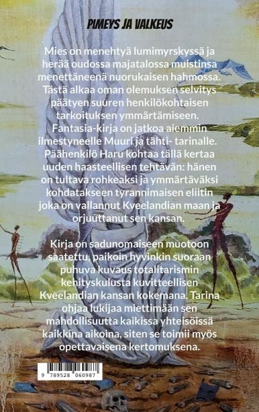 Pimeys ja valkeus Mies on menehtyä lumimyrskyssä ja herää oudossa majatalossa muistinsa menettäneenä nuorukaisen hahmossa. Tästä alkaa oman olemuksen selvitys päätyen suuren henkilökohtaisen tarkoituksen ymmärtämiseen. Fantasia-kirja on jatkoa aiemmin ilmestyneelle Muuri ja tähti- tarinalle. Päähenkilö Haru kohtaa tällä kertaa uuden haasteellisen tehtävän: hänen on tultava rohkeaksi ja ymmärtäväksi kohdatakseen tyrannimaisen eliitin joka on vallannut Kveelandian maan ja orjuuttanut sen kansan. Kirja on sadunomaiseen muotoon saatettu, paikoin hyvinkin suoraan puhuva kuvaus totalitarismin kehityskulusta kuvitteellisen Kveelandian kansan kokemana. Tarina ohjaa lukijaa miettimään sen mahdollisuutta kaikissa yhteisöissä kaikkina aikoina, siten se toimii myös opettavaisena kertomuksena.