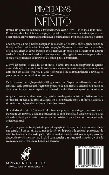 Get ready for an enchanting journey with "Pinceladas do Infinito" by Raquel Lajes. This book illuminates the intersection between tangible reality and intangible spirit. Each poem is like a beam of light pulsating in the cosmic vastness, weaving together themes of faith, artistic expression, mysticism, and contemplation. Lajes' work is a mosaic of feelings and thoughts, an invitation to reflect on the universe and our place within it. Pinceladas do Infinito is a voyage beyond the visible horizon, an exploration of the landscapes of the soul. This book is an invitation to explore the heart of the universe and discover the secret colors of existence. It calls to dreamers, creatives, and truth-seekers-all those who seek meaning and wonder. Upon reading "Pinceladas do Infinito," you will enter a world where the stars remind you of your own infinite potential.