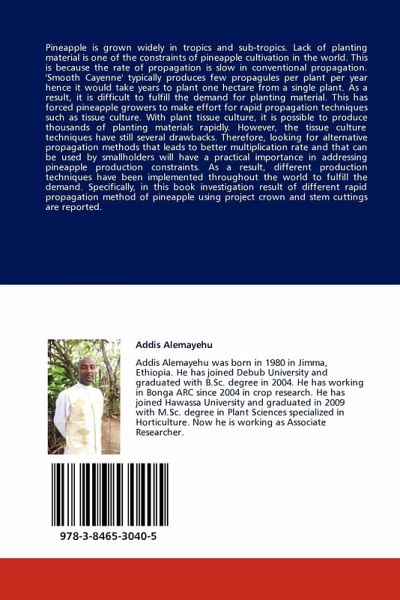 Pineapple is grown widely in tropics and sub-tropics. Lack of planting material is one of the constraints of pineapple cultivation in the world. This is because the rate of propagation is slow in conventional propagation. 'Smooth Cayenne' typically produces few propagules per plant per year hence it would take years to plant one hectare from a single plant. As a result, it is difficult to fulfill the demand for planting material. This has forced pineapple growers to make effort for rapid propagation techniques such as tissue culture. With plant tissue culture, it is possible to produce thousands of planting materials rapidly. However, the tissue culture techniques have still several drawbacks. Therefore, looking for alternative propagation methods that leads to better multiplication rate and that can be used by smallholders will have a practical importance in addressing pineapple production constraints. As a result, different production techniques have been implemented throughoutthe world to fulfill the demand. Specifically, in this book investigation result of different rapid propagation method of pineapple using project crown and stem cuttings are reported.
