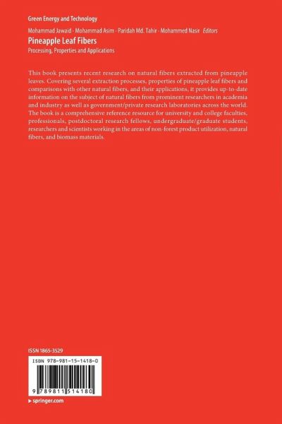 This book presents recent research on natural fibers extracted from pineapple leaves. Covering several extraction processes, properties of pineapple leaf fibers and comparisons with other natural fibers, and their applications, it provides up-to-date information on the subject of natural fibers from prominent researchers in academia and industry as well as government/private research laboratories across the world. The book is a comprehensive reference resource for university and college faculties, professionals, postdoctoral research fellows, undergraduate/graduate students, researchers and…mehr