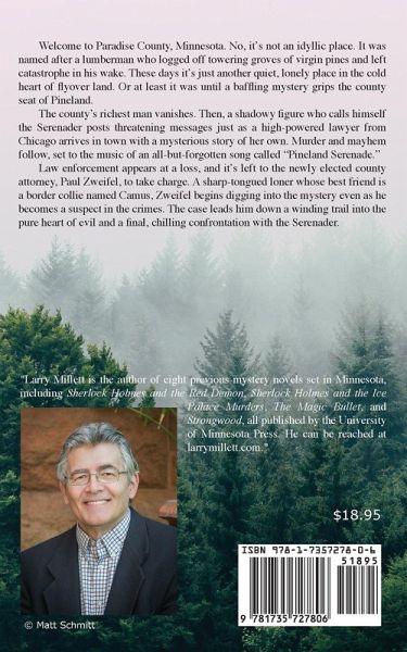 Welcome to Paradise County, Minnesota. No, it doesn't resemble the original Garden of Eden. It was named after a nineteenth-century lumberman who turned its towering groves of virgin pines into stumps, setting the stage for a huge forest fire that killed 400 people. After that catastrophe, settlers arrived to build hardscrabble farms out of the ashes, and the county became just another lonely, quiet place in the cold heart of flyover land. But that all changed one day when a baffling mystery began to unfold in the county seat of Pineland, a small town of under three thousand people on the banks of the Paradise River. The county's richest man, Peter Swindell, vanishes after his hilltop mansion is blown to bits. Soon, vaguely threatening messages appear all around town, posted by a shadowy figure who calls himself the Serenader. A high-powered lawyer from Chicago suddenly appears in Pineland, with a mysterious story of her own to tell. Murder and mayhem follow, set to the curious music of an old and all-but-forgotten song called "Pineland Serenade." Local and state law enforcement officials appear unable to solve the mystery-or perhaps they are part of it, hiding old and deep secrets. It's left to the newly elected county attorney, Paul Zweifel, to solve the case. A sharp-tongued loner whose best friend is an existential border collie named Camus, Zweifel begins digging into the mystery even as he becomes a suspect in the crimes. The case leads him down a winding trail into the pure heart of evil and a final, chilling confrontation with the Serenader.