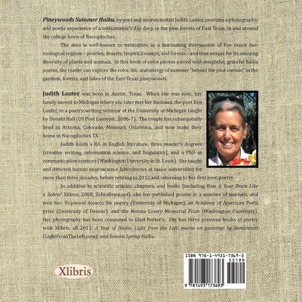 Judith Lauter (JudithLauter.com) was born in Austin, Texas. When she was nine, her family moved to Michigan where she later met her husband, the poet Ken Lauter, in a poetry-writing seminar at the University of Michigan taught by Donald Hall (US Poet Laureate, 2006-7). Th e couple has subsequently lived in the deserts of Arizona, the mountains of Colorado, the prairies of Missouri and Oklahoma, and now make their home in the pineywoods of Nacogdoches TX. Judith holds a BA in English literature, three master's degrees (creative writing, library/information science, and linguistics), and a PhD in communication sciences (Washington University in St. Louis). She taught and directed human neuroscience laboratories at major universities for more than three decades, before retiring in 2012 and returning to her fi rst loves, photography and poetry. In addition to scientifi c articles, chapters, and books (including How is Your Brain Like a Zebra? Xlibris, 2008, ZebraBrain.net), she has published poems in journals, and won two Hopwood Awards for poetry (University of Michigan), an Academy of American Poets prize (University of Denver), and the Norma Lowry Memorial Prize (Washington University). Her prize-winning photography has been compared to Eliot Porter's; reproductions (including selections from this book) are available at FineArtAmerica.com. She has published eight previous books of poetry-and-images with Xlibris, plus a book of photos and poems about Wallace Stevens with the Stephen F. Austin State University Press (see inside for titles).