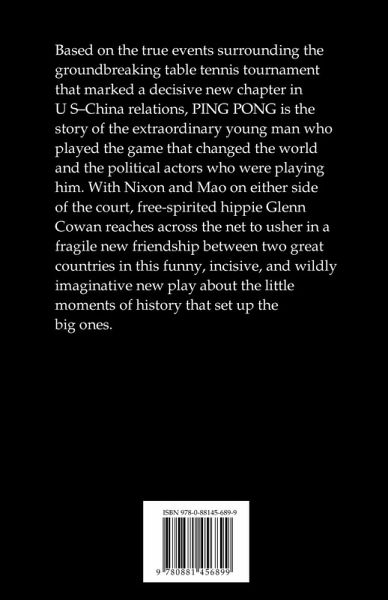 Based on the true events surrounding the groundbreaking table tennis tournament that marked a decisive new chapter in U S–China relations, PING PONG is the story of the extraordinary young man who played the game that changed the world and the political actors who were playing him. With Nixon and Mao on either side of the court, free-spirited hippie Glenn Cowan reaches across the net to usher in a fragile new friendship between two great countries in this funny, incisive, and wildly imaginative new play about the little moments of history that set up the big ones.