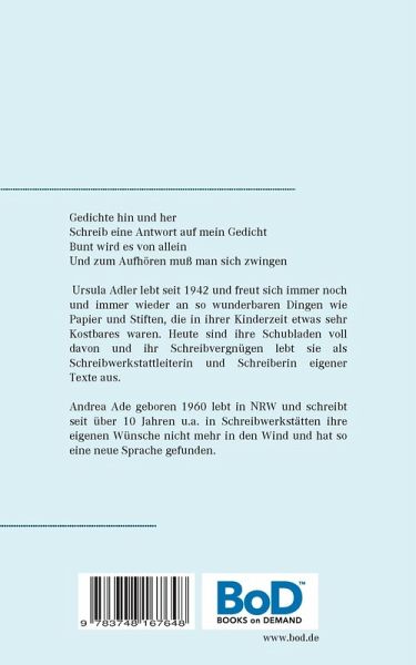 Ursula Adler lebt seit 1942 und freut sich immer noch und immer wieder an so wunderbaren Dingen wie Papier und Stiften, die in ihrer Kinderzeit etwas sehr Kostbares waren. Heute sind ihre Schubladen voll davon, und ihr Schreibvergnügen lebt sie als Schreibwerkstattleiterin und Schreiberin eigener Texte aus.
