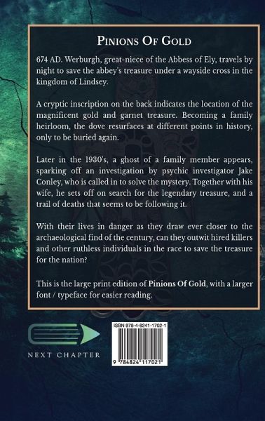 674 AD. Werburgh, great-niece of the Abbess of Ely, travels by night to save the abbey's treasure under a wayside cross in the kingdom of Lindsey. A cryptic inscription on the back indicates the location of the magnificent gold and garnet treasure. Becoming a family heirloom, the dove resurfaces at different points in history, only to be buried again. Later in the 1930's, a ghost of a family member appears, sparking off an investigation by psychic investigator Jake Conley, who is called in to solve the mystery. Together with his wife, he sets off on search for the legendary treasure, and a trail of deaths that seems to be following it. With their lives in danger as they draw ever closer to the archaeological find of the century, can they outwit hired killers and other ruthless individuals in the race to save the treasure for the nation? This is the large print edition of Pinions Of Gold, with a larger font / typeface for easier reading.