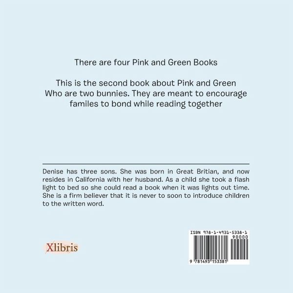 This is the first book about Pink and Green, who are two bunnies. They are meant to encourage bonding for children with their families.