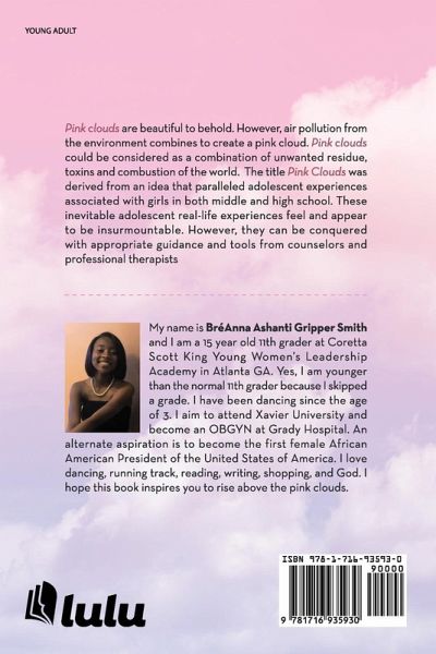 Pink clouds are beautiful to behold. However, air pollution from the environment combines to create a pink cloud. Pink clouds could be considered as a combination of unwanted residue, toxins and combustion of the world. The title Pink Clouds was derived from an idea that paralleled adolescent experiences associated with girls in both middle and high school. These inevitable adolescent real-life experiences feel and appear to be insurmountable. However, they can be conquered with appropriate guidance and tools from counselors and professional therapists