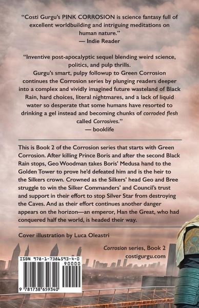 This is Book 2 of the Corrosion series that starts with Green Corrosion. After killing Prince Boris and after the second Black Rain stops, Geo Woodman takes Boris' Medusa hand to the Golden Tower to prove he'd defeated him and is the heir to the Silkers crown. Crowned as the Silkers' head Geo and Bree struggle to win the Silker Commanders' and Council's trust and support in their effort to stop Silver Star from destroying the Caves. And as their effort continues another danger appears on the horizon-an emperor, Han the Great, who had conquered half the world, is headed their way.