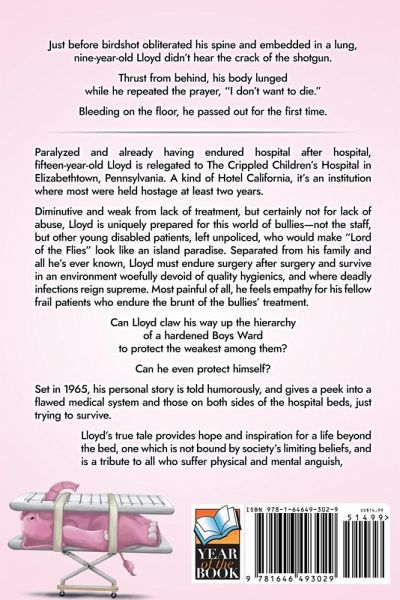 Just before birdshot obliterated his spine and embedded in a lung,nine-year-old Lloyd didn't hear the crack of the shotgun.Thrust from behind, his body lunged while he repeated the prayer, "I don't want to die."Bleeding on the floor, he passed out for the first time. Paralyzed and already having endured hospital after hospital, fifteen-year-old Lloyd is relegated to The Crippled Children's Hospital in Elizabethtown, Pennsylvania. A kind of Hotel California, it's an institution where most were held hostage at least two years. Diminutive and weak from lack of treatment, but certainly not for lack of abuse, Lloyd is uniquely prepared for this world of bullies-not the staff, but other young disabled patients, left unpoliced, who would make "Lord of the Flies" look like an island paradise. Separated from his family and all he's ever known, Lloyd must endure surgery after surgery and survive in an environment woefully devoid of quality hygienics, and where deadly infections reigned supreme. Most painful of all, he feels empathy for his fellow frail patients who endure the brunt of the bullies' treatment. Can Lloyd claw his way up the hierarchy of a hardened Boys Ward to protect the weakest among them? Can he even protect himself? Set in 1965, his personal story is told humorously, and gives a peek into a flawed medical system and those on both sides of the hospital beds, just trying to survive. Lloyd's true tale provides hope and inspiration for a life beyond the bed, one which is not bound by society's limiting beliefs, and is a tribute to all who suffer physical and mental anguish.