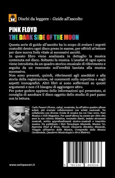 Questa serie di guide all'ascolto ha lo scopo di svelare i segreti custoditi dentro ogni disco preso in esame, per offrirli al lettore per dare nuova linfa vitale ai successivi ascolti. In questo libro viene analizzata in dettaglio la musica contenuta nel disco. Soltanto la musica. L'analisi di ogni opera viene introdotta da un quadro storico-musicale di riferimento e seguita da un resoconto sull'eredità lasciata alla musica successiva. Non sono presenti, quindi, riferimenti agli aneddoti e alla storia della registrazione, né commenti sulla copertina e sugli aspetti iconografici. Altri libri si sono soffermati su questi argomenti e non c'è bisogno di aggiungere altro. Per poter godere appieno delle informazioni qui presentate, si consiglia di ascoltare il disco oggetto dello studio di pari passo con la lettura. Indice dei contenuti: -Introduzione -Speak to Me -Breathe -On the Run -Time -The Great Gig in the Sky -Money -Us and Them -Any Colour You Like -Brain Damage -Eclipse -Conclusione. -1972: la Luna "crescente" -David Gilmour -Il "caso" Alan Parsons Project