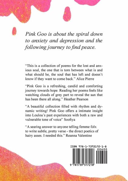 Pink Goo is about a spiral down to anxiety and depression and the following journey to find peace. After trying to shed light on social injustice, sexual harassment and the climate collapse, the poet finds herself in the darkness and explores many corners within herself, rough and soft. In the deep furrows of her mind, Éloïse finds a white canvas on which she paints with colours to lift her spirit while allowing nuances of grey to tell the depth of reality. These poems are to aid the reader who wants to scream but doesn't find the words. They are a balm to spread on trauma wounds. They care for the soul after a storm. "This is a collection of poems for the lost and anxious soul, the one that is torn between what is and what should be, the soul that has left and doesn't know if they want to come back." Alice Pierre "Pink Goo is a refreshing, candid and comforting journey towards hope. Reading her poems feels like watching clouds of grey part to reveal the sun that has been there all along." Heather Pearson "A beautiful collection filled with rhythm and dynamic writing! Pink Goo offers an intimate insight into Loulou's past experiences with both and vulnerable tone of voice." Soofiya "A searing answer to anyone to anyone telling femme folx to write subtle, pretty verse - the direct poetics of hairy asses. I needed this." Reanna Valentine