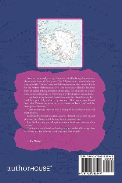 Some ten thousand years ago, Earth was visited by beings from another planet in the Barnard's Star system. The Babylonians recorded that beings they called the Oannes were amphibious creatures who came to Earth for the welfare of the human race. The historian Hellandus describes them as having fishlike features but the head, feet, and arms of a man. They instructed humans in everything a civilized nation should know. They built a city beneath Antarctica near the Davis Sea and have lived there peacefully and secretly ever since. But now a rogue Dwarf Star called Zarama threatens the very existence of both Earth and the home planet, Nazmos. Their mythology predicts that a being from another planet will avert disaster. Enter Ashley Bonner into this scenario. He has been granted special gifts, and the Oannes think he may be the predicted one. Can Ashley really prevail against a star a third more massive than the sun? This is the story of Ashley's development to manhood from age four to seventy and his ultimate sacrifice to save both worlds. -C. J. Harvey