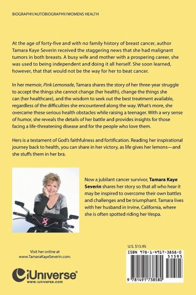 At the age of forty-five and with no family history of breast cancer, author Tamara Kaye Severin received the staggering news that she had malignant tumors in both breasts. A busy wife and mother with a prospering career, she was used to being independent and doing it all herself. She soon learned, however, that that would not be the way for her to beat cancer. In her memoir, Pink Lemonade, Tamara shares the story of her three-year struggle to accept the things she cannot change (her health), change the things she can (her healthcare), and the wisdom to seek out the best treatment available, regardless of the difficulties she encountered along the way. What's more, she overcame these serious health obstacles while raising a teenager. With a wry sense of humor, she reveals the details of her battle and provides insights for those facing a life-threatening disease and for the people who love them. Hers is a testament of God's faithfulness and fortification. Reading her inspirational journey back to health, you can share in her victory, as life gives her lemons-and she stuffs them in her bra.