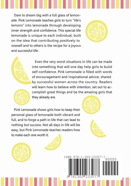 Dare to dream big with a full glass of lemonade. Pink Lemonade teaches girls to turn "life's lemons" into lemonade through developing inner strength and confidence. This special life lemonade is unique to each individual, built on the idea that contributing positively to oneself and to others is the recipe for a joyous and successful life. Even the very worst situations in life can be made into something that will one day help girls to build self-confidence. Pink Lemonade is filled with words of encouragement and inspirational advice, shared by successful women across the country. Readers will learn how to believe with intention, set out to accomplish great things and be the amazing girls that they already are. Pink Lemonade shows girls how to keep their personal glass of lemonade both vibrant and full, and to forge a path in life that can lead to nothing but success. Not all days in life will be easy, but Pink Lemonade teaches readers how to make each one worth it.