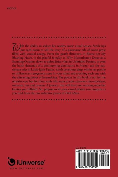 With the ability to seduce her readers erotic visual senses, Sarah lays out each poem to tell the story of a passionate tale of erotic prose filled with sensual energy. From the gentle flirtations in Blame not My Blushing Heart, to the playful foreplay in Why Masturbation Deserves a Standing Ovation, down to aphrodisiac vibes in Unbridled Passion, to even the harsh demands of a domineering dominatrix in Master and the passionate cries in Lucid Ignis Fatuus. Sarah penetrates deep within her psyche to titillate every erogenous zone in your mind and touching each one with the climaxing power of lovemaking. The poetry in this book is not for the sensitive eyes but for those souls who want to take a journey into eroticism, romance, lust and passion. A journey that will leave you wanting more but leaving you fulfilled. So, prepare to let your carnal desires run rampant as you read from the raw seductive power of Pink Moon.