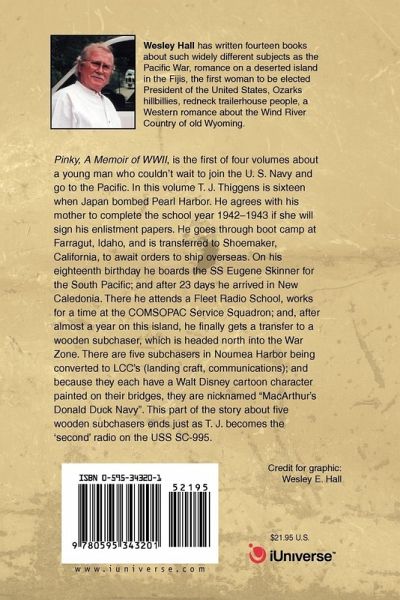 Pinky, A Memoir of WWII, is the first of four volumes about a young man who couldn't wait to join the U. S. Navy and go to the Pacific. In this volume T. J. Thiggens is sixteen when Japan bombed Pearl Harbor. He agrees with his mother to complete the school year 1942-1943 if she will sign his enlistment papers. He goes through boot camp at Farragut, Idaho, and is transferred to Shoemaker, California, to await orders to ship overseas. On his eighteenth birthday he boards the SS Eugene Skinner for the South Pacific; and after 23 days he arrived in New Caledonia. There he attends a Fleet Radio School, works for a time at the COMSOPAC Service Squadron; and, after almost a year on this island, he finally gets a transfer to a wooden subchaser, which is headed north into the War Zone. There are five subchasers in Noumea Harbor being converted to LCC's (landing craft, communications); and because they each have a Walt Disney cartoon character painted on their bridges, they are nicknamed "MacArthur's Donald Duck Navy". This part of the story about five wooden subchasers ends just as T. J. becomes the 'second' radio on the USS SC-995.