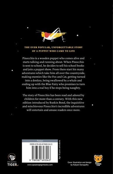 The ever popular, unforgettable story of a puppet who came to life. Pinocchio is a wooden puppet who comes alive and starts talking and running about. When Pinocchio is sent to school, he decides to sell his school books and join a puppet show. From there start his many adventures which take him all over the countryside, making enemies like the Fox and Cat, getting turned into a donkey, being swallowed by a whale and ending up with the Blue Fairy who promises to turn him into a real boy if he stops being naughty. The story of Pinocchio has been read and adored by children for more than a century. With this new edition introduced by Ruskin Bond, the inquisitive and mischievous Pinocchio’s incredible adventures will entertain and amuse readers once more.