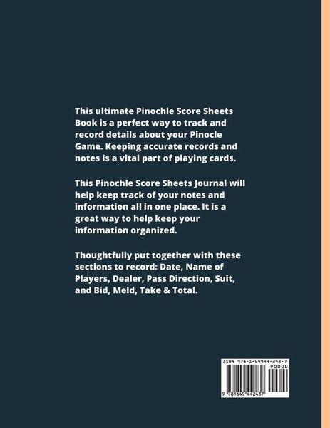 Perfect for family game night or with friends! This pinochle score pad book/journal is great and convenient for keeping score of your pinochle games. Each page layout sheet has space to record:Date Names Of Players For Team A & Team B Dealer/ Pass Direction Suit Team A Bid, Meld/Take & Total Team B Bid, Meld/Take & Total If you love to play pinochle, this score pad is a great way to make your gaming experience more exciting. Makes a great gift for the special person in your life for Christmas or birthday or any occasion. Easy to use. Grab one today. Large size of 8.5x11 inches, 98 pages, soft matte finish cover, quality white paper, paperback.