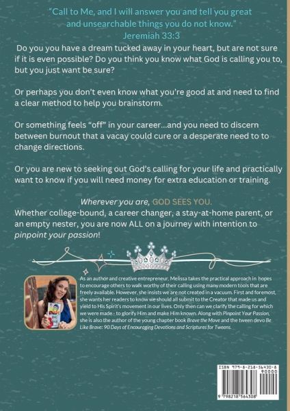 Are you searching for clarity on God's purpose for your life? Pinpoint Your Passion is a faith-based Christian workbook designed to help you uncover your God-given gifts, passions, and calling. Whether you're at a crossroads or simply longing for deeper spiritual direction, this interactive Bible study guide will lead you through self-reflection, scripture-based insights, and practical exercises to help you step confidently into God's plan for you. What You'll Find Inside: ¿ Biblical Foundations for Purpose - Explore key scriptures that reveal God's plan for your life. ¿ Guided Reflections & Journaling - Thought-provoking prompts to help you align your passions with faith. ¿ Overcoming Obstacles - Identify what's holding you back and learn how to trust God's timing. ¿ Practical Action Steps - Walk away with a clear, faith-driven path toward your calling. Perfect for personal devotions, small group Bible studies, and Christian women's or men's discipleship programs. If you're ready to take the next step in your spiritual journey, this Christian workbook is for you! Great for: ¿ Women's and men's* faith-based study groups (*We are developing a men's only study, as this one is directed mainly to women. However, the tools found in this workbook remain the same and will still be effective for men as well.) ¿ Christian personal development ¿ Discovering purpose through biblical wisdom ¿ A spiritual gift discovery tool Buy now and start uncovering God's purpose for your life today!