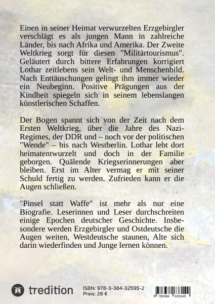 Einen in seiner Heimat verwurzelten Erzgebirgler verschlägt es als jungen Mann in zahlreiche Länder, bis nach Afrika und Amerika. Der Zweite Weltkrieg sorgt für diesen "Militärtourismus". Geläutert durch bittere Erfahrungen korrigiert Lothar zeitlebens sein Welt- und Menschenbild. Nach Enttäuschungen gelingt ihm immer wieder ein Neubeginn. Positive Prägungen aus der Kindheit spiegeln sich in seinem lebenslangen künstlerischen Schaffen. Der Bogen spannt sich von der Zeit nach dem Ersten Weltkrieg, über die Jahre des Nazi-Regimes, der DDR und - noch vor der politischen "Wende" - bis nach Westberlin. Lothar lebt dort heimatentwurzelt und doch in der Familie geborgen. Quälende Kriegserinnerungen aber bleiben. Erst im Alter vermag er mit seiner Schuld fertig zu werden. Zufrieden kann er die Augen schließen."Pinsel statt Waffe" ist mehr als nur eine Biografie. Die Leserinnen und Leser durchschreiten einige Epochen deutscher Geschichte.