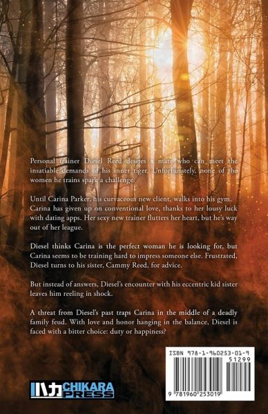 Personal trainer Diesel Reed desires a mate who can meet the insatiable demands of his inner tiger. Unfortunately, none of the women he trains spark a challenge. Until Carina Parker, his curvaceous new client, walks into his gym. Carina has given up on conventional love, thanks to her lousy luck with dating apps. Her sexy new trainer flutters her heart, but he's way out of her league. Diesel thinks Carina is the perfect woman he is looking for, but Carina seems to be training hard to impress someone else. Frustrated, Diesel turns to his sister, Cammy Reed, for advice. But instead of answers, Diesel's encounter with his eccentric kid sister leaves him reeling in shock. A threat from Diesel's past traps Carina in the middle of a deadly family feud. With love and honor hanging in the balance, Diesel is faced with a bitter choice: duty or happiness?