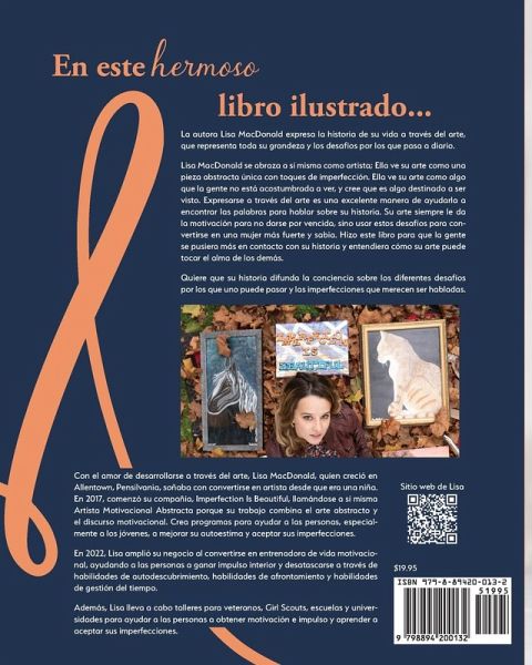 En este hermoso Libro ilustrado... La autora Lisa MacDonald expresa la historia de su vida a través del arte, que representa toda su grandeza y los desafíos por los que pasa a diario. Lisa MacDonald se abraza a sí misma como artista; Ella ve su arte como una pieza abstracta única con toques de imperfección. Ella ve su arte como algo que la gente no está acostumbrada a ver, y cree que es algo destinado a ser visto. Expresarse a través del arte es una excelente manera de ayudarla a encontrar las palabras para hablar sobre su historia. Su arte siempre le da la motivación para no darse por vencida, sino usar estos desafíos para convertirse en una mujer más fuerte y sabia. Hizo este libro para que la gente se pusiera más en contacto con su historia y entendiera cómo su arte puede tocar el alma de los demás. Quiere que su historia difunda la conciencia sobre los diferentes desafíos por los que uno puede pasar y las imperfecciones que merecen ser habladas.