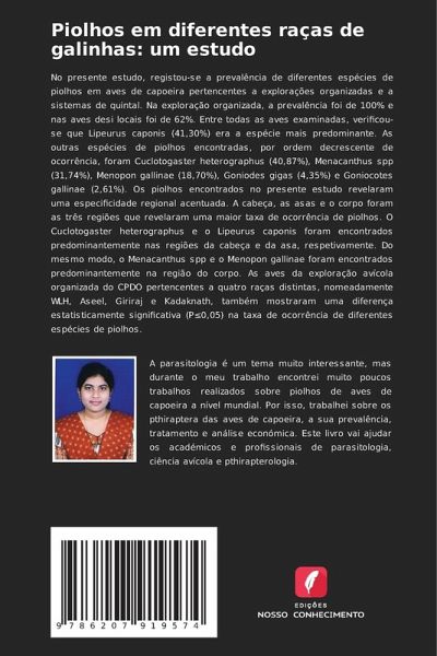 No presente estudo, registou-se a prevalência de diferentes espécies de piolhos em aves de capoeira pertencentes a explorações organizadas e a sistemas de quintal. Na exploração organizada, a prevalência foi de 100% e nas aves desi locais foi de 62%. Entre todas as aves examinadas, verificou-se que Lipeurus caponis (41,30%) era a espécie mais predominante. As outras espécies de piolhos encontradas, por ordem decrescente de ocorrência, foram Cuclotogaster heterographus (40,87%), Menacanthus spp (31,74%), Menopon gallinae (18,70%), Goniodes gigas (4,35%) e Goniocotes gallinae (2,61%). Os piolhos encontrados no presente estudo revelaram uma especificidade regional acentuada. A cabeça, as asas e o corpo foram as três regiões que revelaram uma maior taxa de ocorrência de piolhos. O Cuclotogaster heterographus e o Lipeurus caponis foram encontrados predominantemente nas regiões da cabeça e da asa, respetivamente. Do mesmo modo, o Menacanthus spp e o Menopon gallinae foram encontrados predominantemente na região do corpo. As aves da exploração avícola organizada do CPDO pertencentes a quatro raças distintas, nomeadamente WLH, Aseel, Giriraj e Kadaknath, também mostraram uma diferença estatisticamente significativa (P¿0,05) na taxa de ocorrência de diferentes espécies de piolhos.